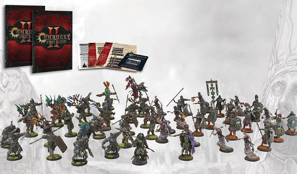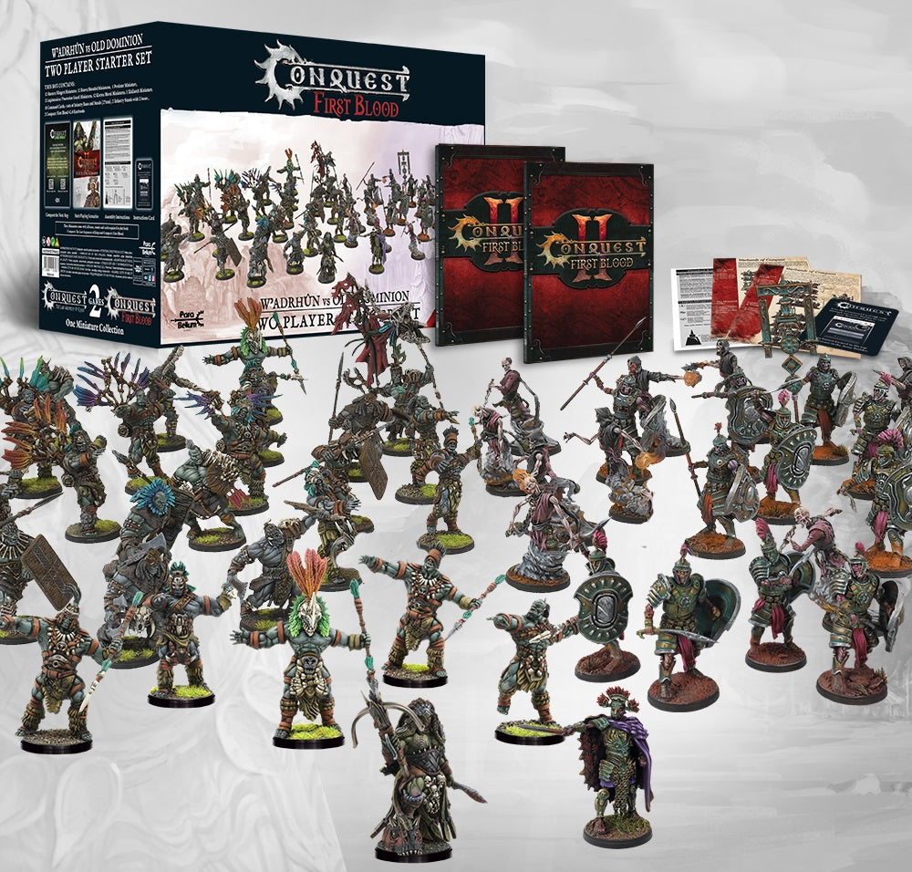 Grab a friend and dive into the world of Conquest: This special 2 player starter set is themed for our fast paced narrative game, First Blood. Like all Conquest miniatures, these may be used to play either First Blood or our mass fantasy battle game The Last Argument of Kings. One miniatures, one world of Ea, two game styles to play! The Old Dominion is our newest, 6th faction, to be released for the Conquest series. Your starter army contains the Kheres, Moroi, Praetorians and Legionairres infantry set with the Xhillarch character. The W’adrhŭn starter army comes ready to play with Blooded, Braves, Hunters, and Slingers infantry sets with the Predator character. This includes 2 deluxe paperback copies of the new 2.0 First Blood rule sets (in English) , Living World Information Cards and a path of Conquest guide that helps players understand how to next advance their game play!