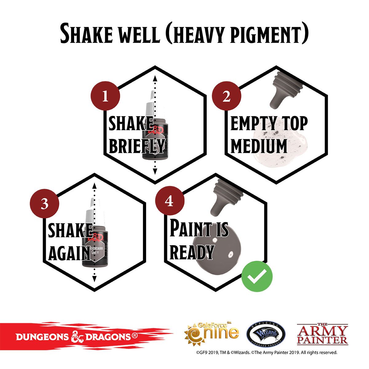 Inside are 30 Dungeons & Dragons themed acrylic colours, 3 specially formulated shades, and 3 gilmmering metallics to paint your magical weaponry, acquired armor, and shimmering loot! Easy enough to use for the beginner painter but equally capable for the experience painter looking to expand their techniques.