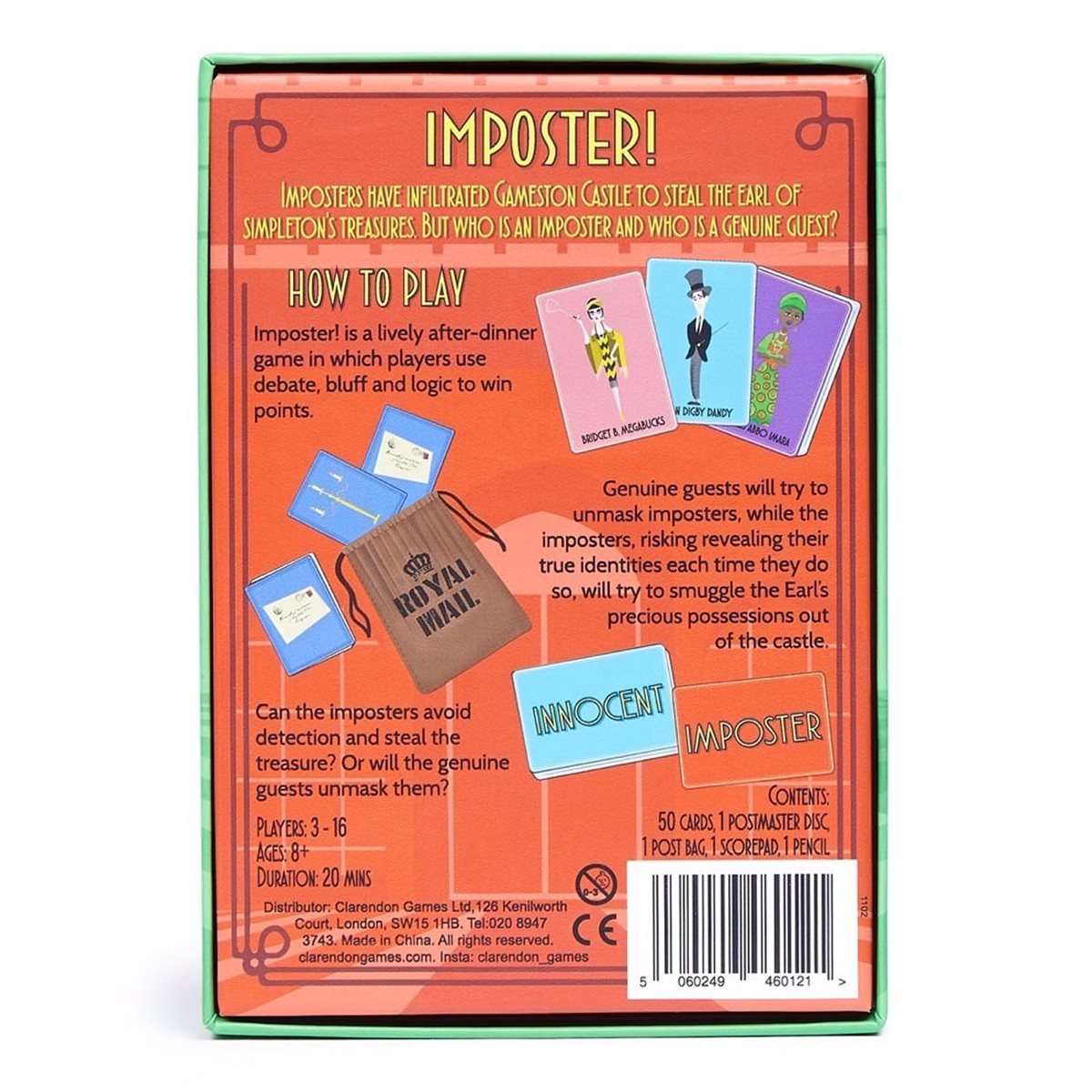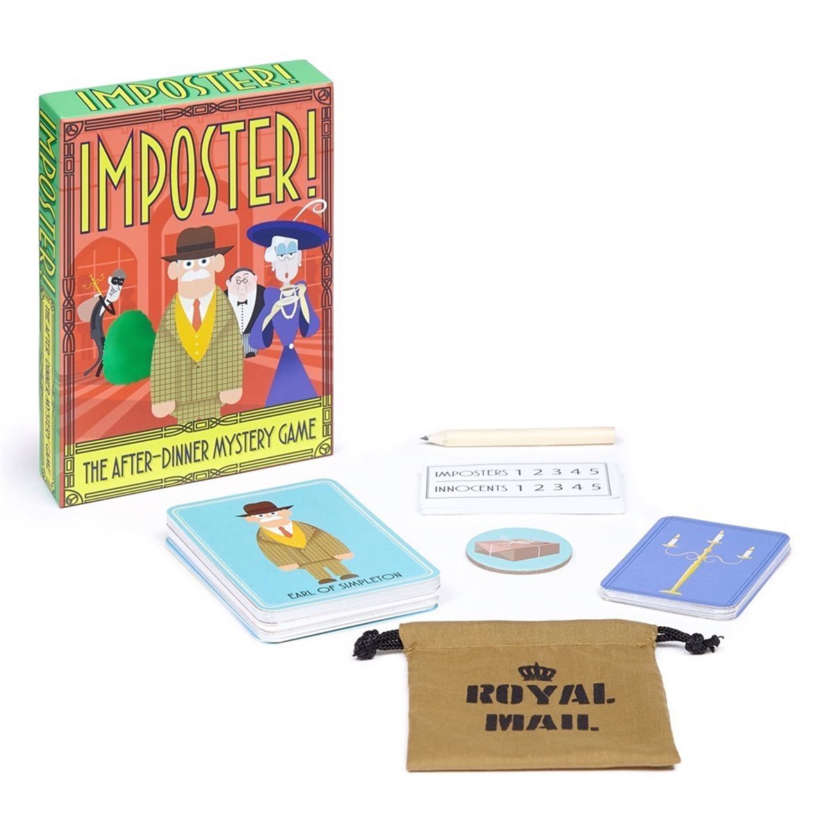 A Murder Mystery-style deduction game: Imposter! is a conversation-based mystery game of social deduction and bluffing. All of you are guests at the Earl of Simpleton’s country estate, but some of you are trying to make off with his treasures undetected. Each round, a selected postmaster will choose some guests to send things out of the castle in the Royal Mail bag. The bag’s contents are revealed at the end of the round, and Imposters score a point if any treasure has made its way into it.